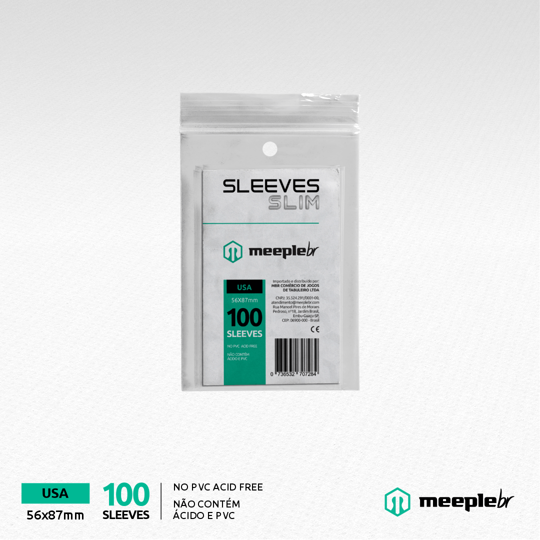 Os Sleeves MeepleBR SLIM – USA (56x87mm) são feitos em polipropileno transparente com 30 micras de espessura, oferecendo proteção contra desgaste, sujeira e marcas de uso, sem ocupar espaço extra na caixa do jogo.