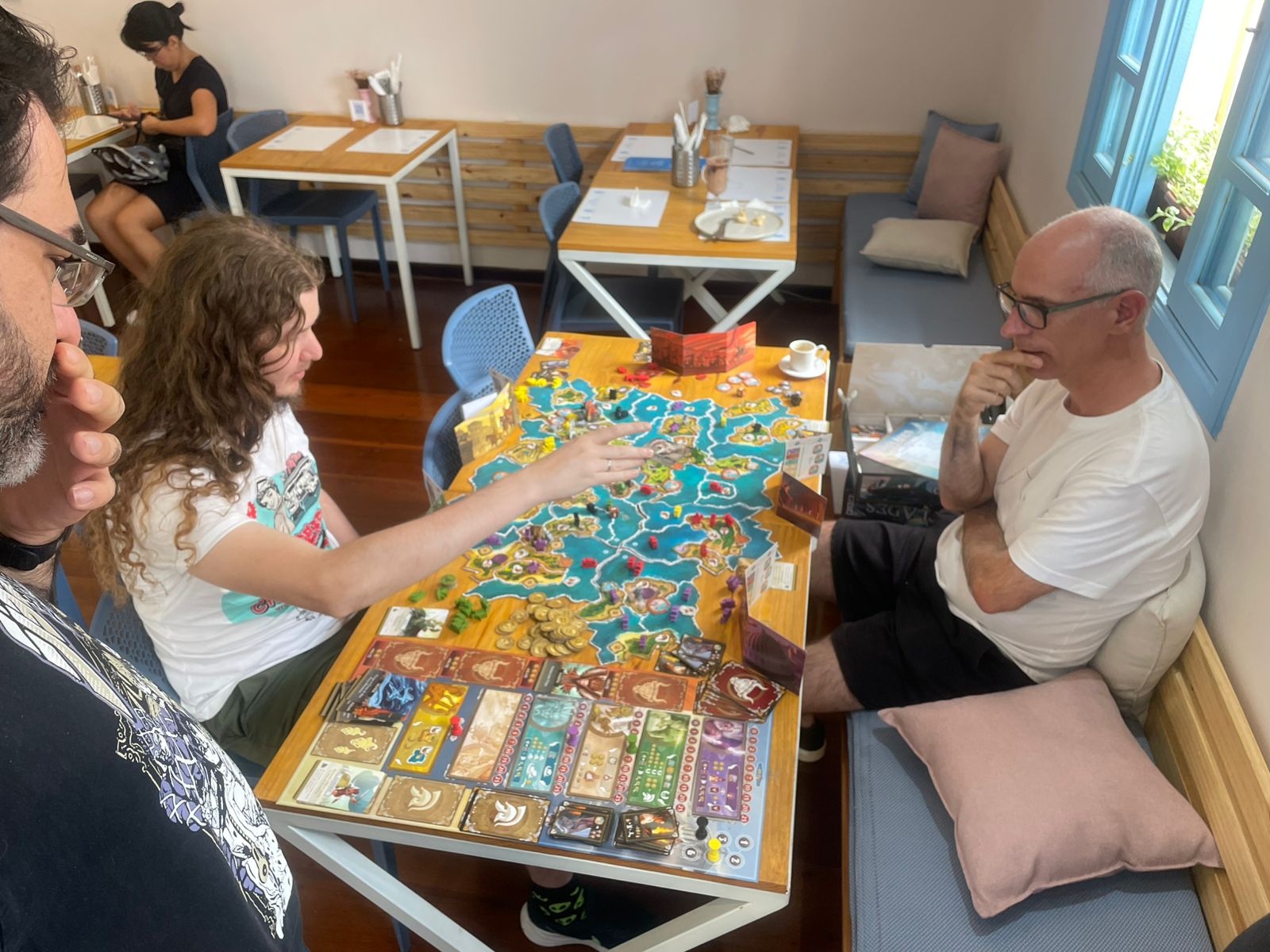 Aos fins de semana entre 13h e 15h o restaurante costuma ficar cheio e com filas de espera, então esse não seria um bom horário para ocupar as mesas por muito tempo. Costumamos jogar a partir das 9 ou 10h até 13h.